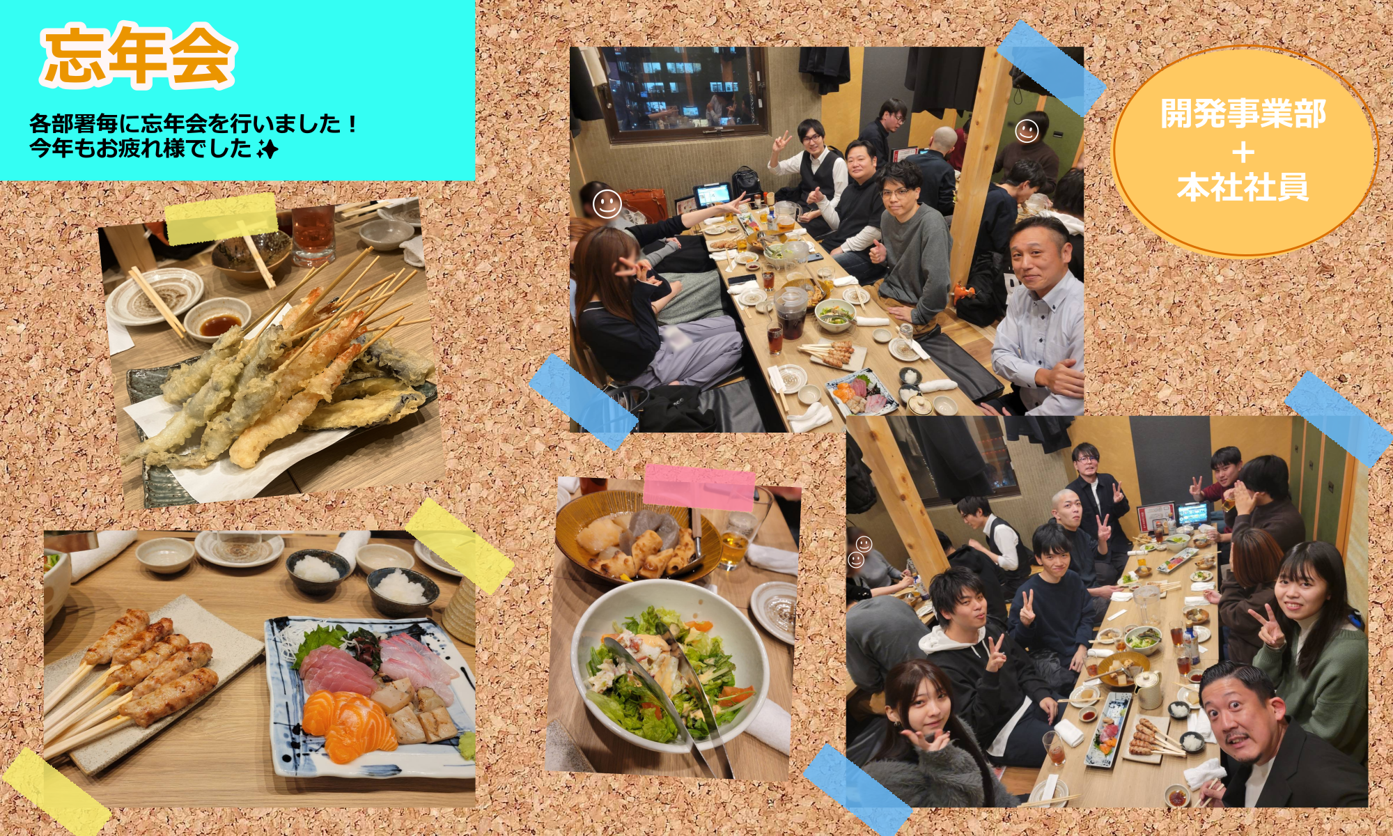 部署ごとに忘年会を行いました🍻 開発事業部の忘年会には、来年4月に入社予定の内定者も招待しました! その他の部署も、それぞれで楽しんでいたようです😊 今年も1年間お疲れ様でした!