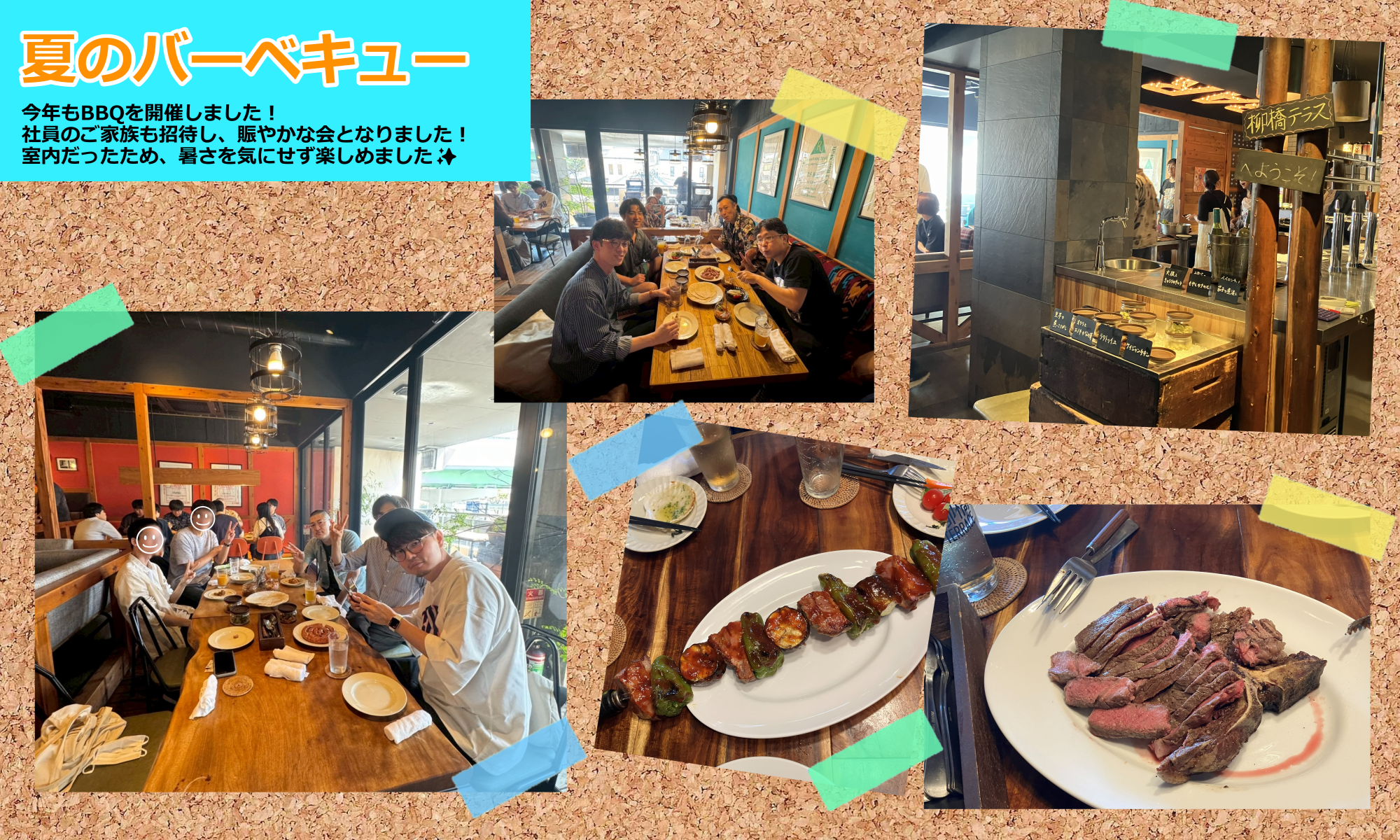 毎年恒例のBBQを今年も行いました! 9月とはいえまだまだ暑い日でしたが、室内でのBBQだったため、涼しい店内で快適に楽しむことができました✨ 社員のご家族も招待し、みんなでワイワイ楽しみました☺️ 大きなTボーンステーキや串焼き肉など、豪華な料理でとても美味しかったです!